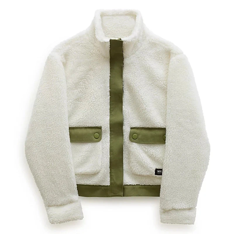 The Vans Tevis Sherpa Fleece Jacket has a mock neck, a button-snap front closure and two front pockets also with button-snap closures. This textured jacket features double-sided Sherpa materials for extra comfort and has the Vans logo on the lower body. It also has contrast colours down the centre front and on the hem and pockets.